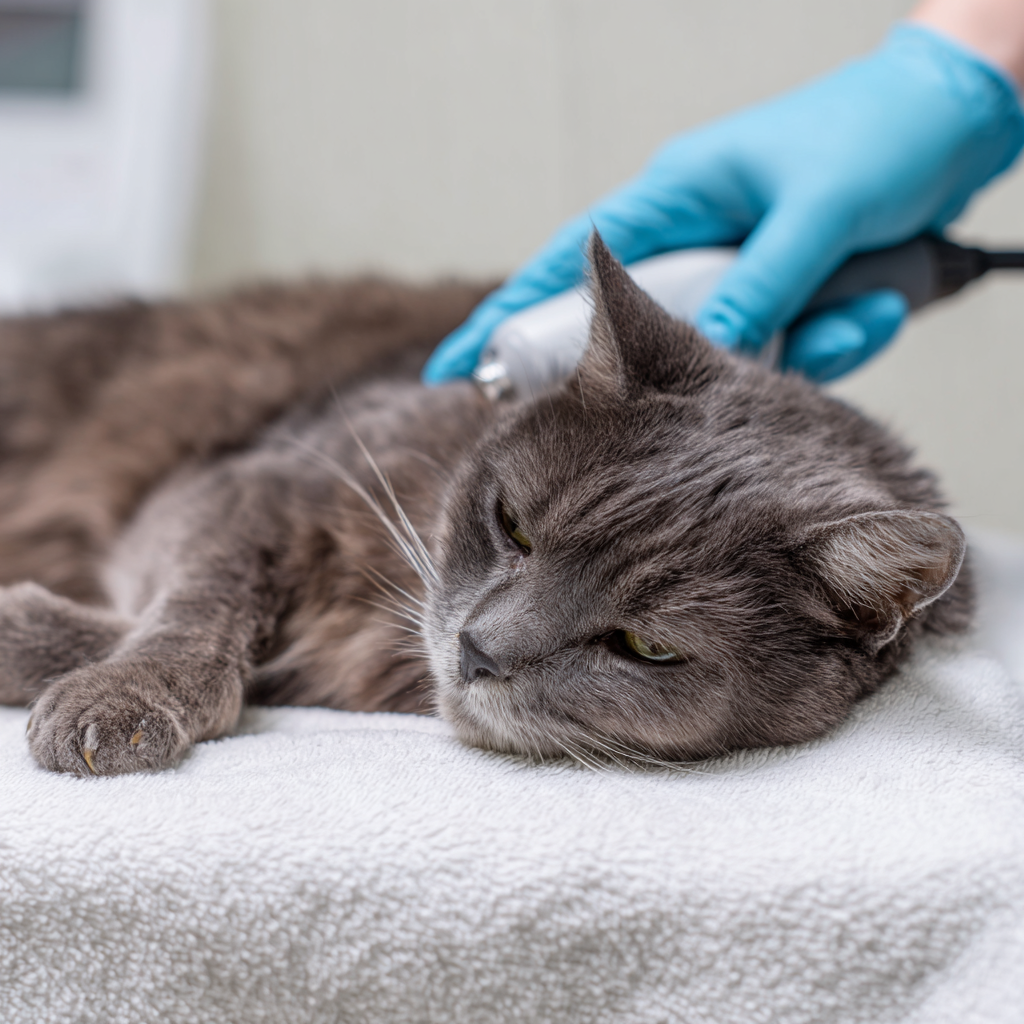 腹部エコー検査(超音波検査)は、三臓器炎の診断に非常に有用な検査です。膵臓の腫れや炎症、胆管の拡張、腸の異常などを直接観察することができます。痛みがなく、猫への負担も少ない検査です。