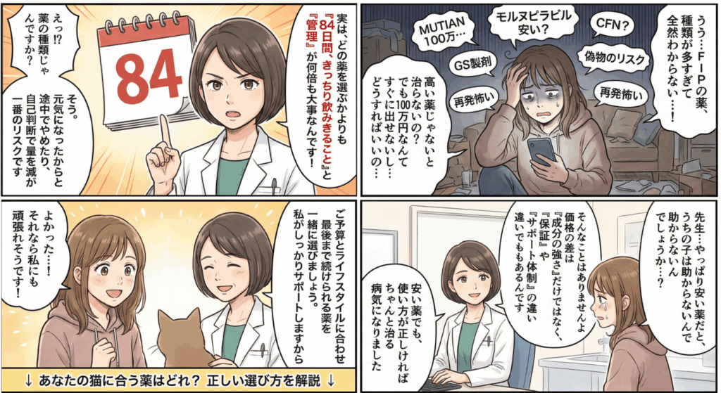 重要なのは「薬の価格」ではなく、「獣医師がFIP治療の経験を持ち、血液検査の数値を見ながら投与量を細かく調整できるか」です。信頼できる獣医師のもとで治療を受けてください。