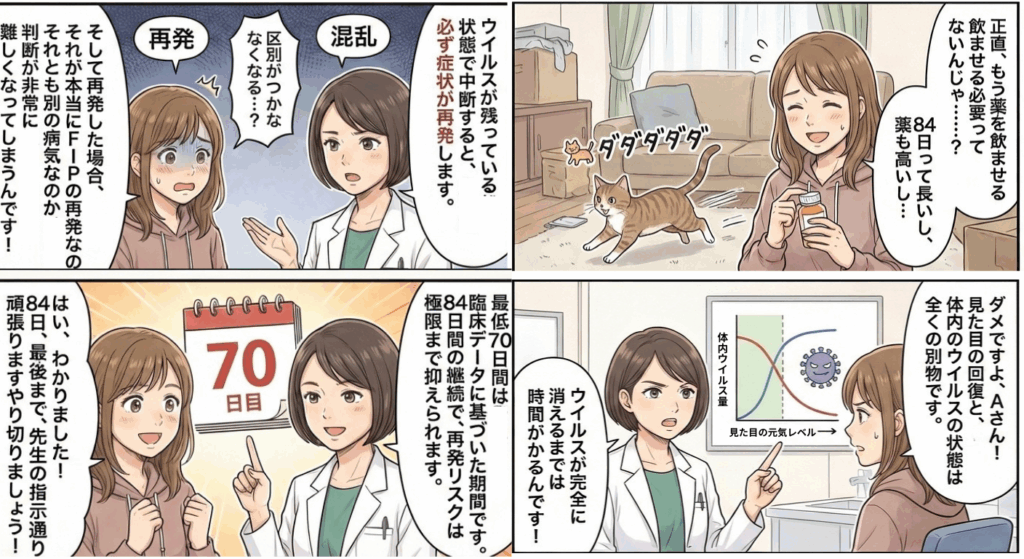 FIP治療でよくある誤解が「症状が良くなったら薬をやめてもいい」というものです。しかし、これは大きな間違いです。
