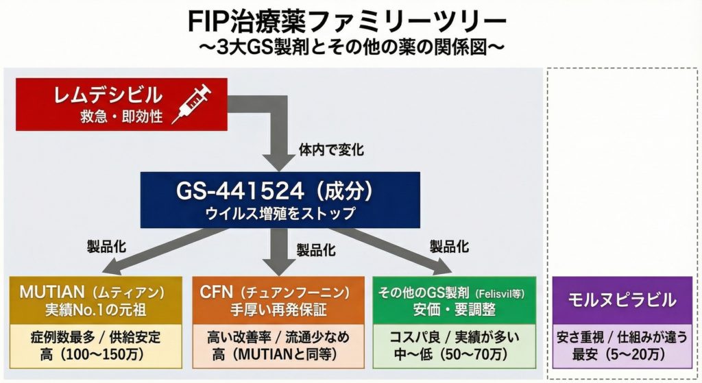FIPの治療薬には、MUTIAN、CFN、その他のGS製剤、モルヌピラビル、レムデシビルなど様々な選択肢があり、それぞれに特徴や価格差があります。