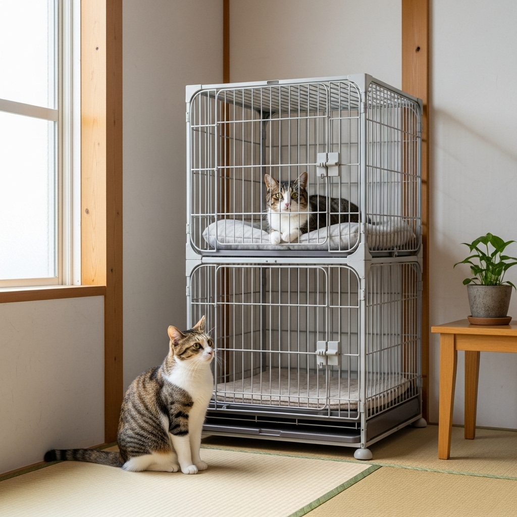同じ部屋でも、新入り猫をケージに入れることで物理的・視覚的な分離が可能です。ケージの半分にタオルをかけて視線を遮れば、お互いの存在を匂いで感じながらも直接的な接触を避けられます。最初の1〜2週間は、ケージ越しの対面からスタートしましょう。